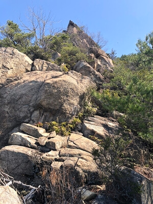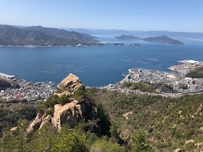 登山口から山頂までは約72分で登ることができます。標高が410mということでそこそこ高い山なのかなというところです。前半は山道ですが後半になるとほぼ岩場しかなくなって、難易度も高くなります。登山道には目印が必ずあって迷うこともなく、景色は広島の宇品や呉の町並みなどを比較的高いところから見ることができました。登山ルートもひそかに2つあって、岩場コースと山道コースで飽きることなく登って下りれます。