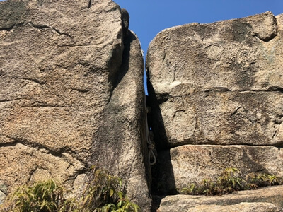 妙に大きな岩がどすんと佇んでいます。ドンガメ岩というらしいです。真ん中にはロープが1本。これは登れということでしょうか。ロープの先端に足をかけて、もう片方は岩場に足をかけて力ずくで登るしかありません。ここまで来ると意地があります。この先がどうなっているのかわかりませんが。ただ登らなくても山頂へはいけます。(登山口から約67分)