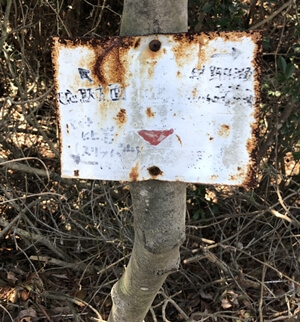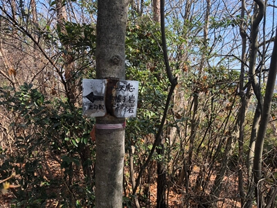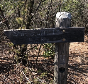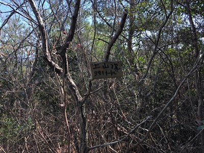 手書き感がハンパありませんが、上山山頂の目印を発見しました。標高391メートルで、約20メートル下ってきました。(烏帽子岩山山頂から約19分)