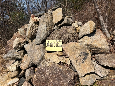 ついに410mの烏帽子岩山山頂へ到着。山頂は何もありませんが、岩で作ったモニュメントがありました。(登山口から約72分)