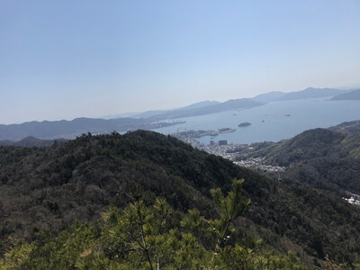 山頂から少し下ったことろにも景色の良いポイントがあって、呉市の町並みをみることができます。休山や音戸まで見渡せるくらいの高さまで登ってきました。