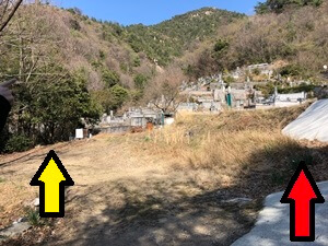 山頂までは2通りの登山ルートがあります。黄色の矢印は岩場がすくなくて登りがずっと続く道です。安全ですが景色はよくありません。赤い矢印は岩場のあるコースです。こちらの方で進んでいきます。(登山口から約3分)