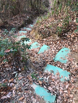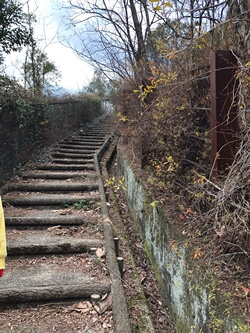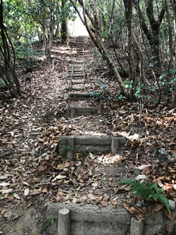 最初から階段の地獄がスタートします。しばらく登り続けますが、階段の間隔が歩幅で合いにくいです。(登山口から約3分)
