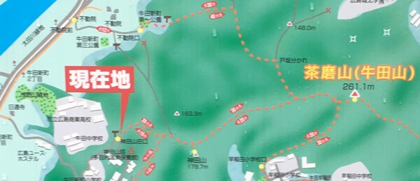 東区牛田地区には、都心の近郊には珍しい、複数の山を縦走することができる全長約5㎞のハイキングコース「牛田山縦走路」があります。